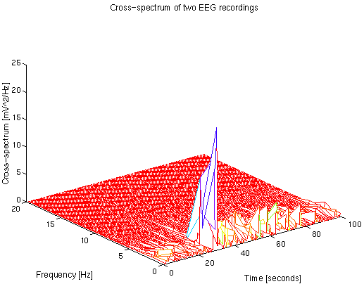 We are currently developping programs for these analyses under the Matlab programming environment. Power spectrum is able to show the energy distribution among the harmonical components of the signal; cross-spectrum and coherence reveal and quantify the linear relationship between processes recorded on different channels. The time evolution of these analyses illustrates the time-frequency dynamic of the biological signal.
